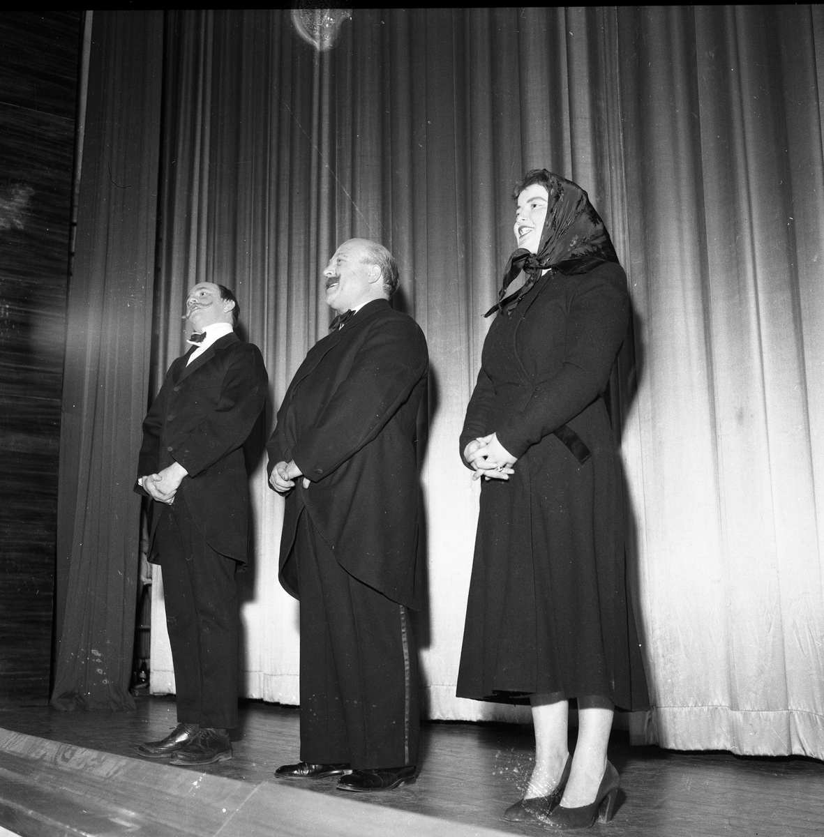 Arbogarevyns medlemmar spelar upp sin Jubileumsrevy. Tre personer står på scenen, två klädda i frack och den tredje i kappa och sjalett.