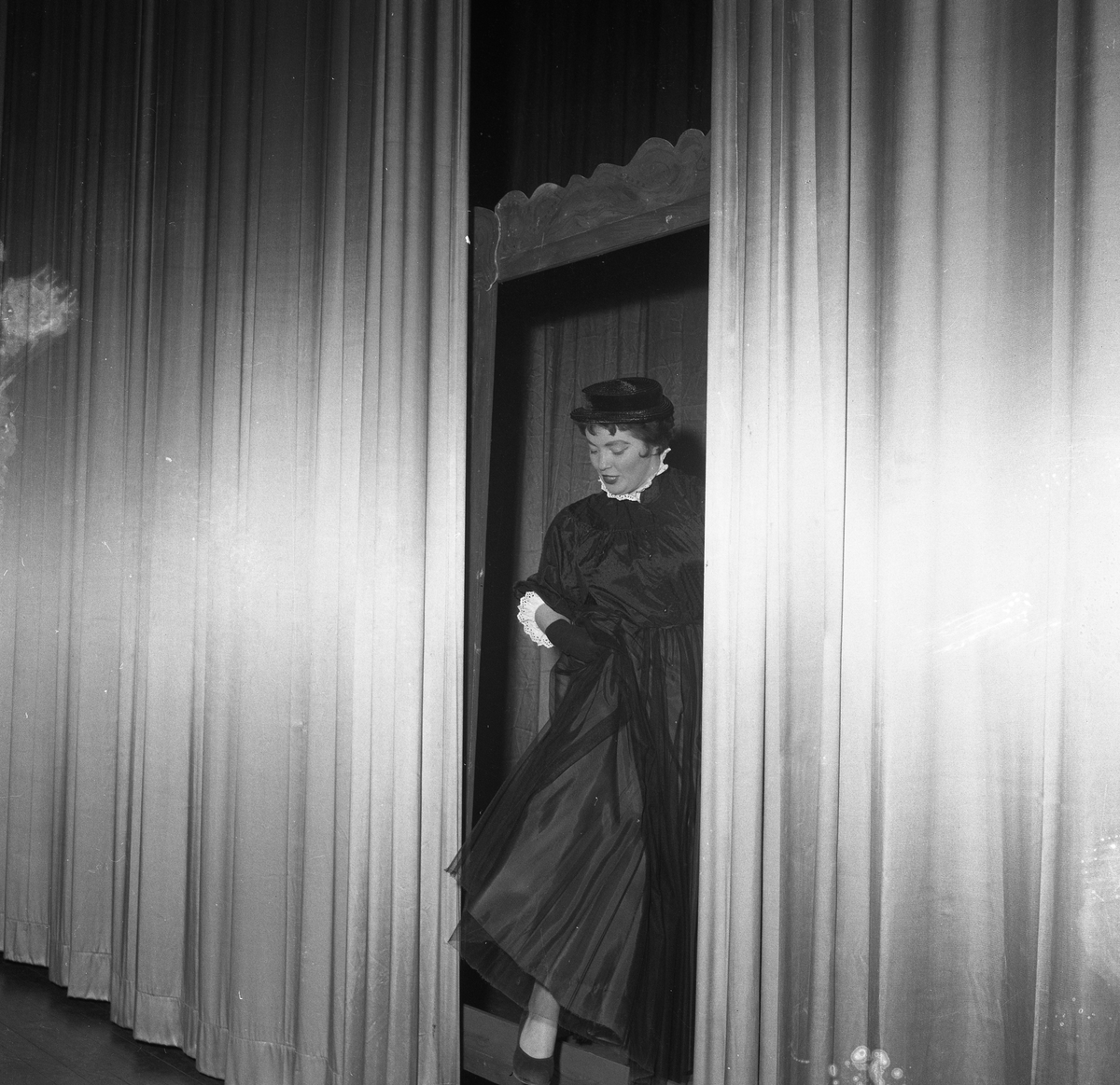 Arbogarevyn spelar upp sin Jubileumsrevy. En kvinna, i hatt och klänning, kliver in på scenen mellan ridåerna.
