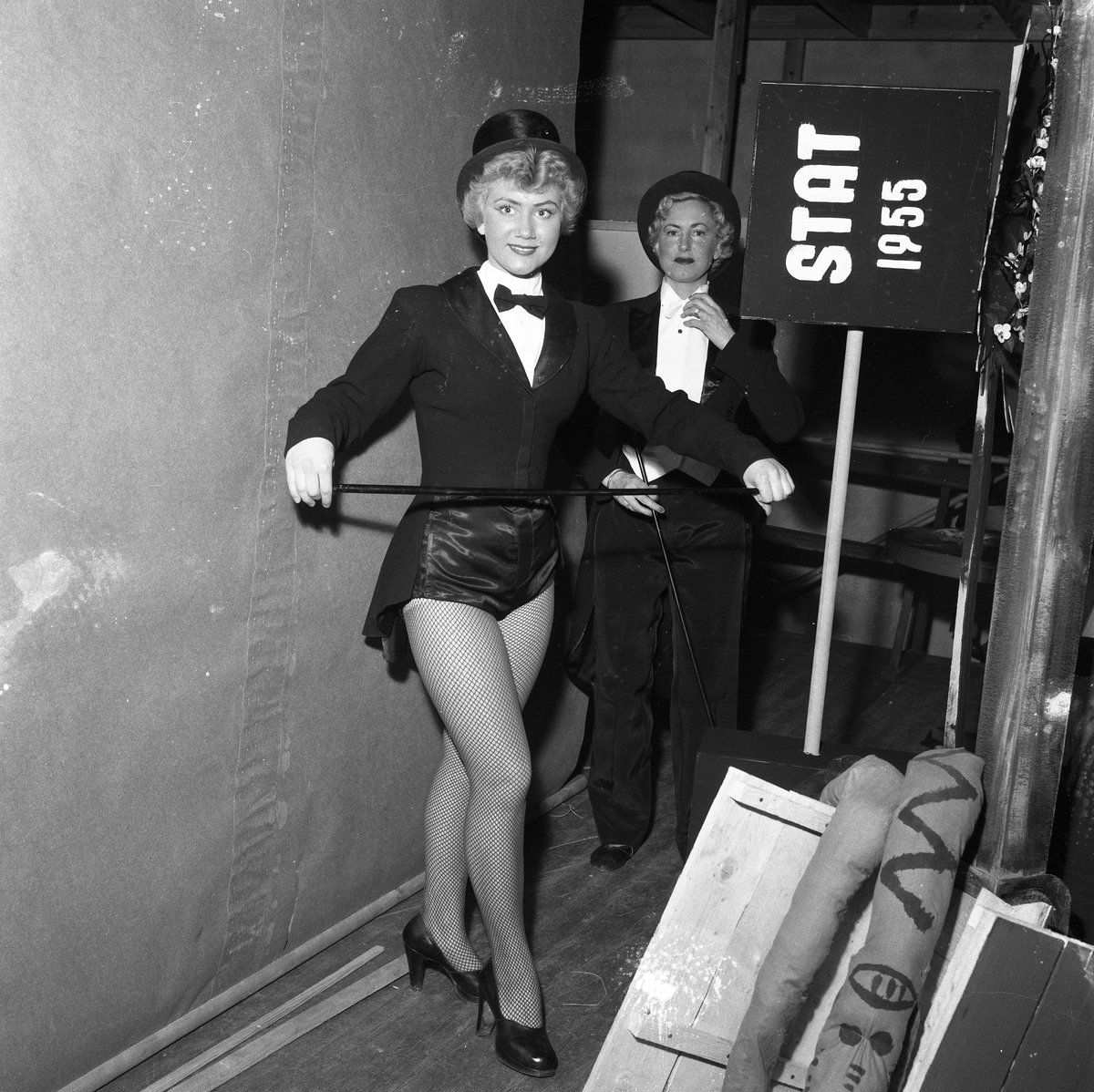 Arbogarevyns medlemmar spelar upp sin Jubileumsrevy. Gullan Kästämä, i kort frack och hög hatt är på väg in på scenen. Efter henne kommer Karin Liljeborg (kallad Noppan) och rätar till skjortkragen före entrén.