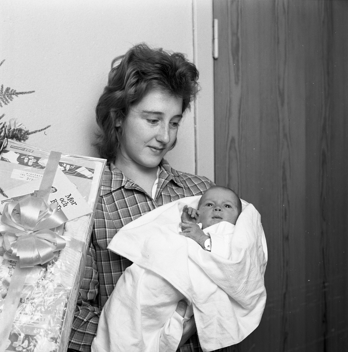 Mor och barn. Kvinna med sitt nyfödda barn i famnen. Barnet är det först födda, i Arboga, på 60-talet.