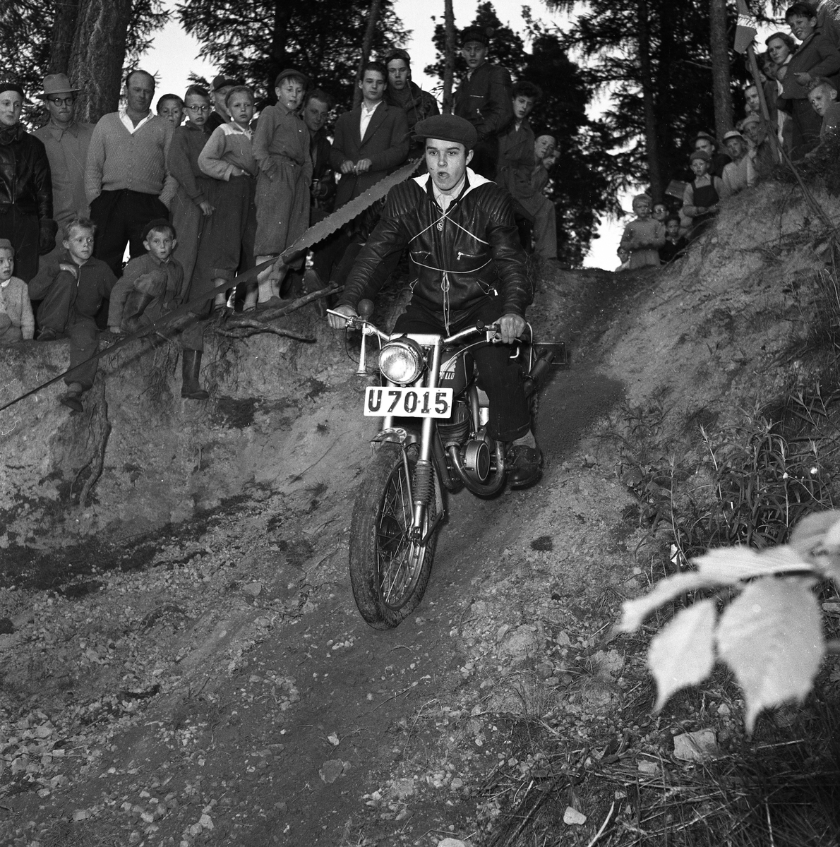 Tävling i terrängkörning med motorcykel. Ung man på väg nerför backe på motorcykel. Publiken står alldeles intill.