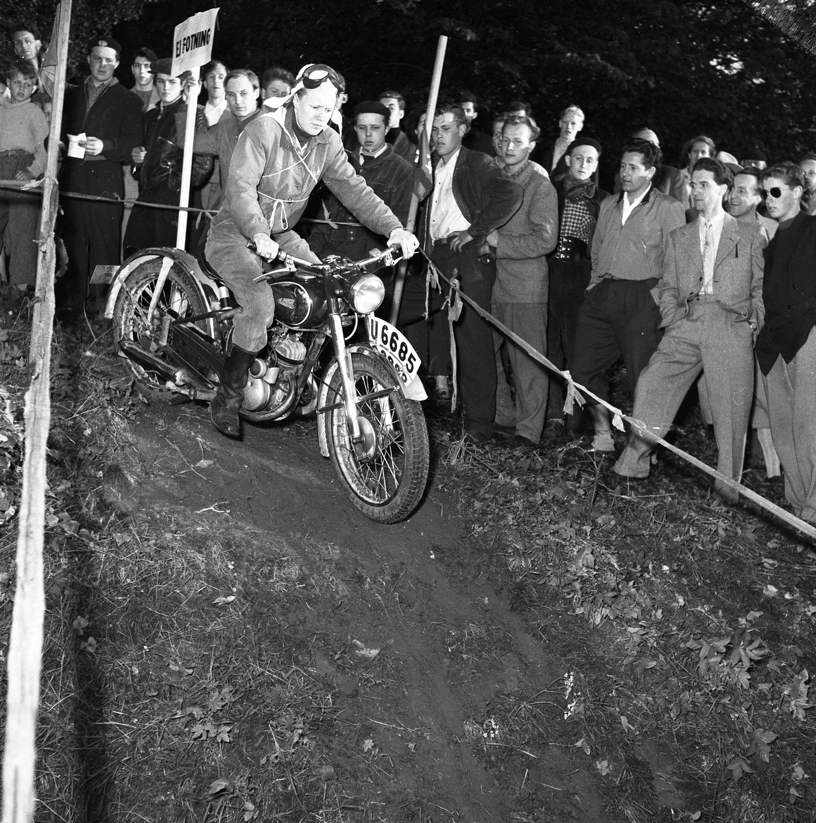Tävling i terrängkörning med motorcykel. Publiken består mest av unga män.