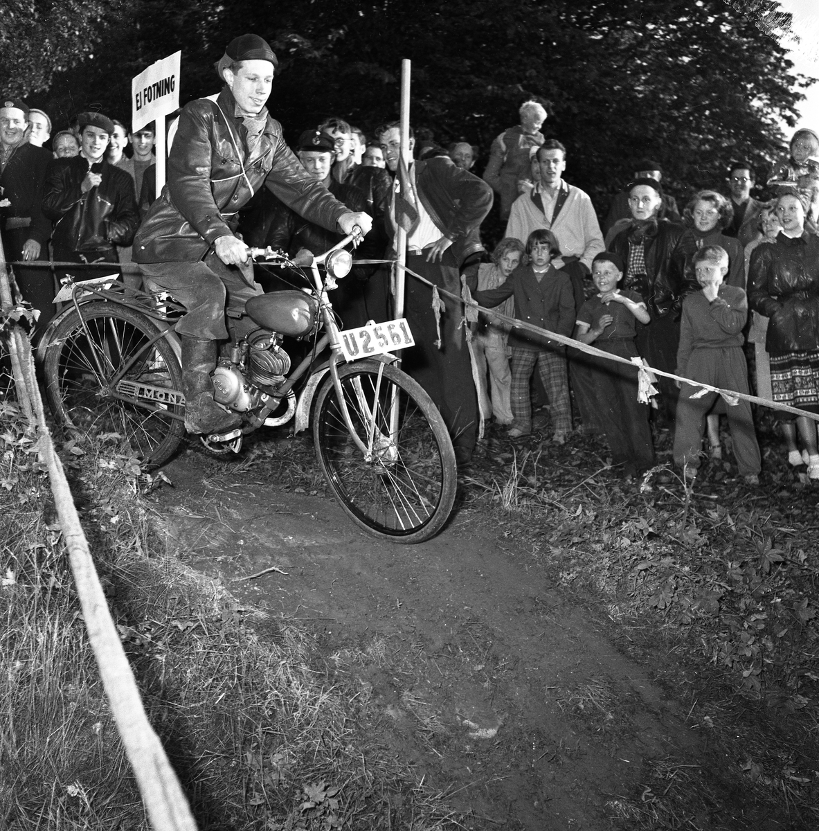 Tävling i terrängkörning med motorcykel. Publiken står alldeles intill banan.