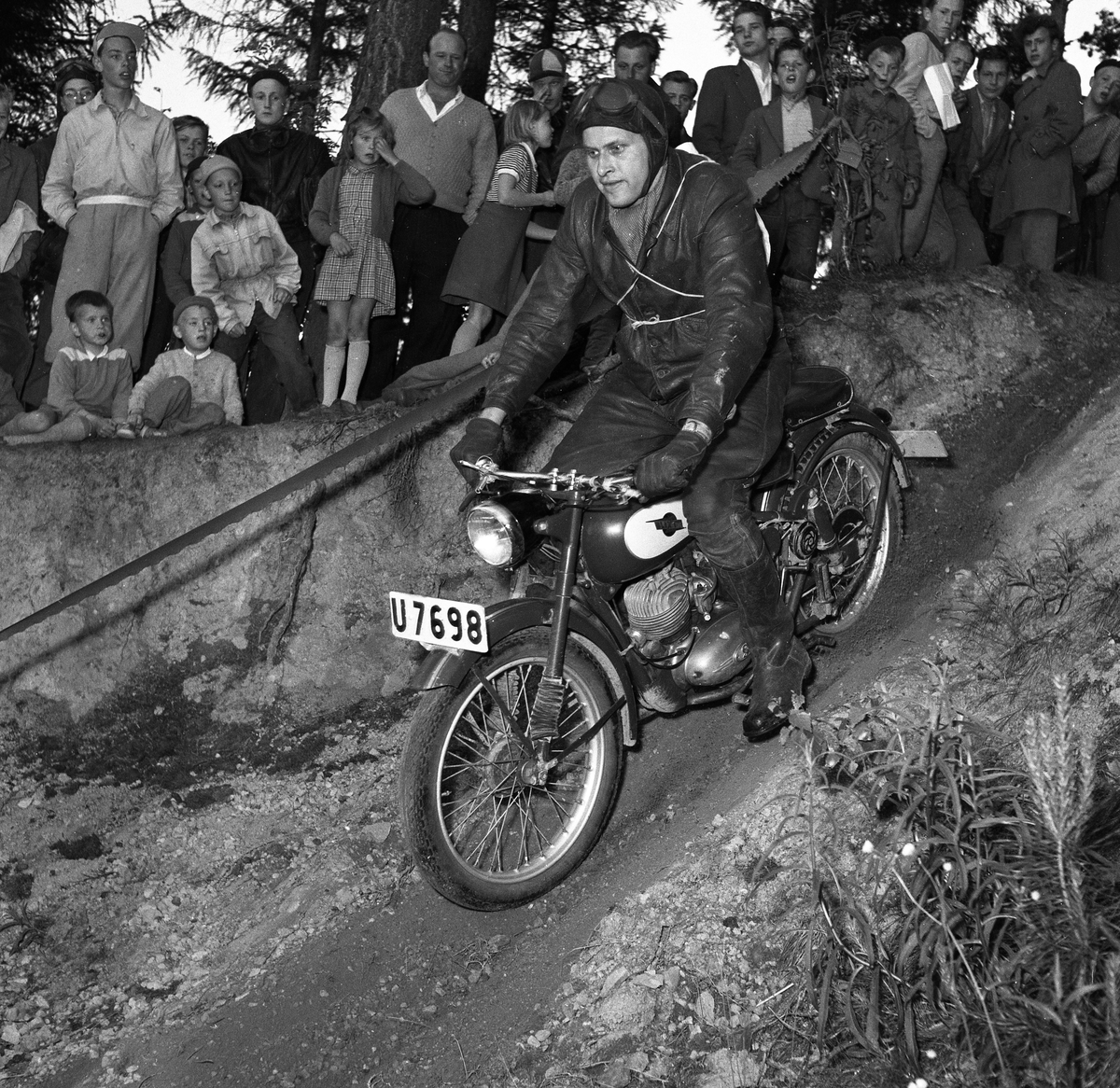 Tävling i terrängkörning med motorcykel. Publiken står alldeles intill banan.