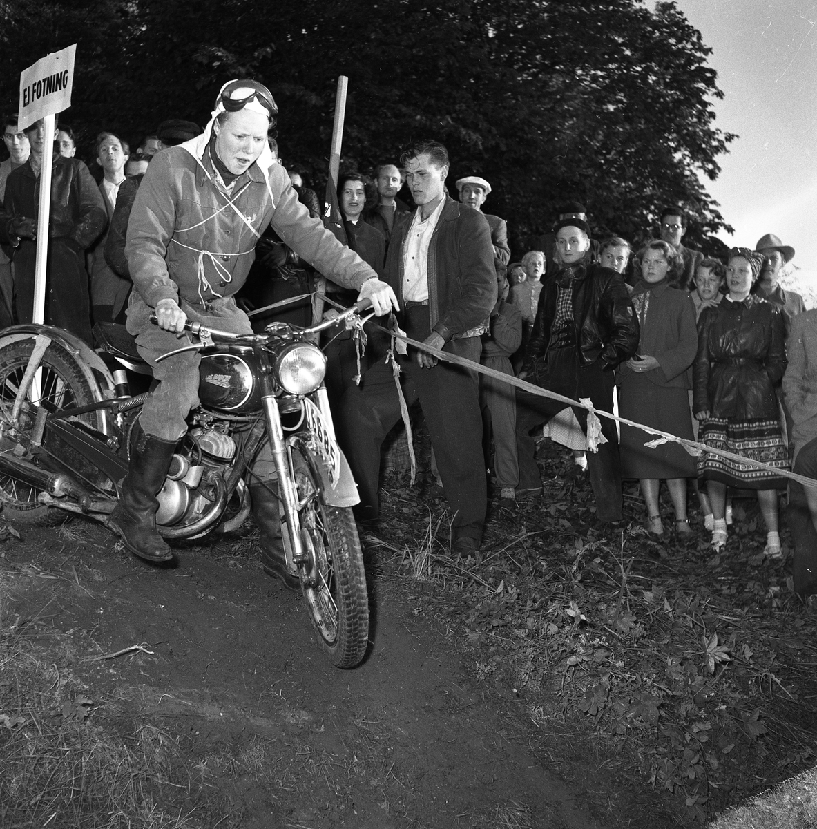 Tävling i terrängkörning med motorcykel. Publiken, kvinnor och män, står alldeles intill banan.