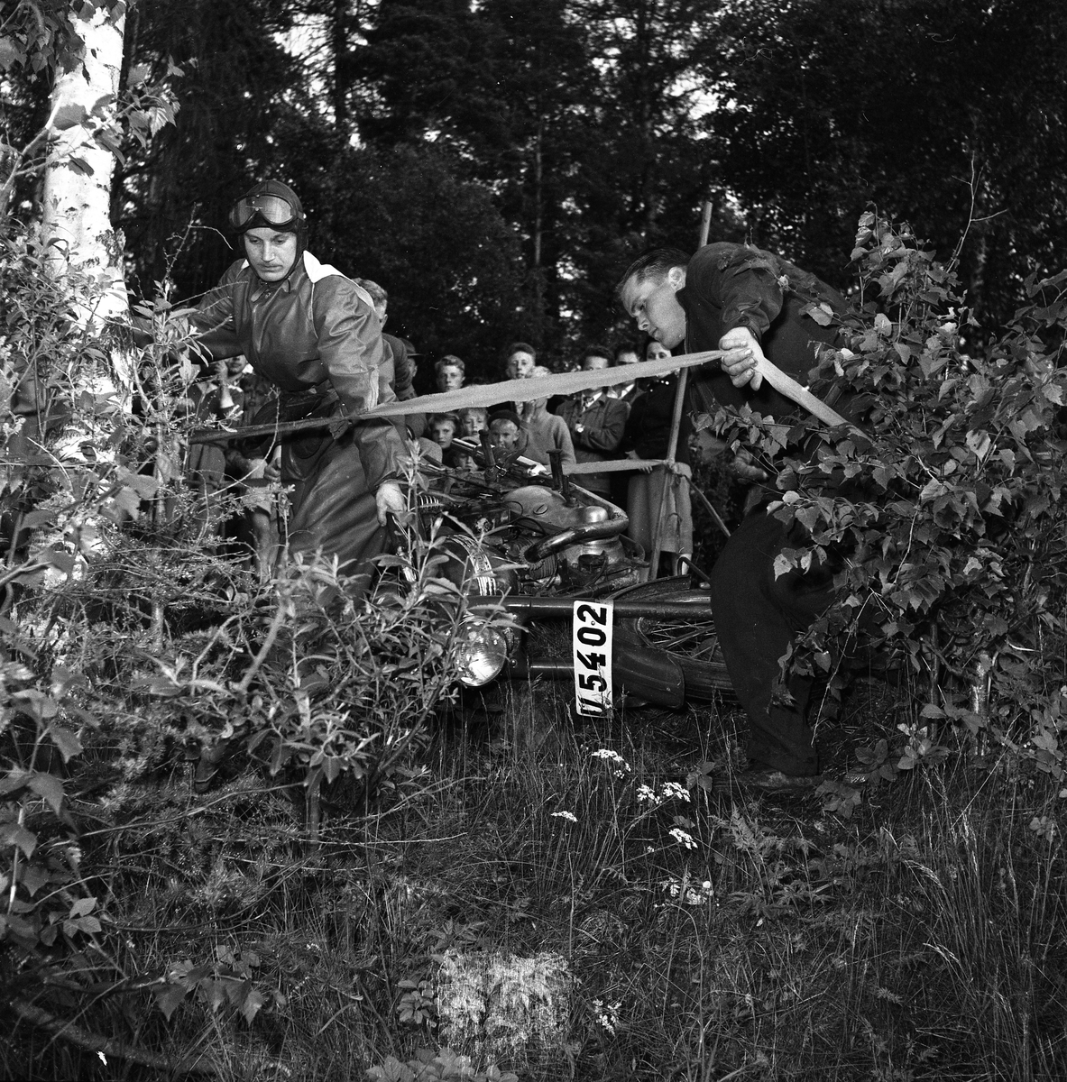 Tävling i terrängkörning med motorcykel. Här har en förare kört av banan. Publiken står alldeles intill.