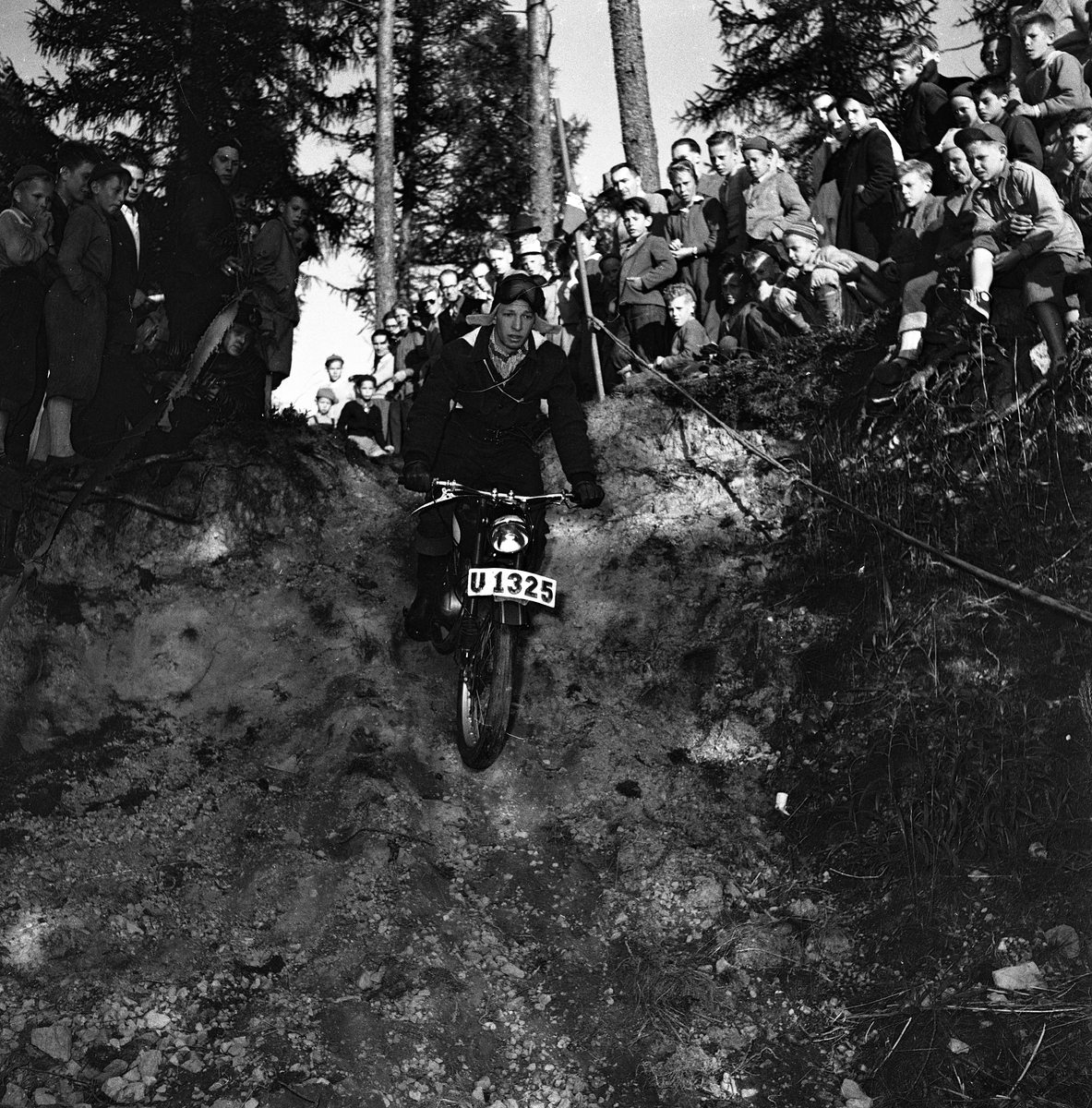Tävling i terrängkörning med motorcykel. Publiken står alldeles intill banan.