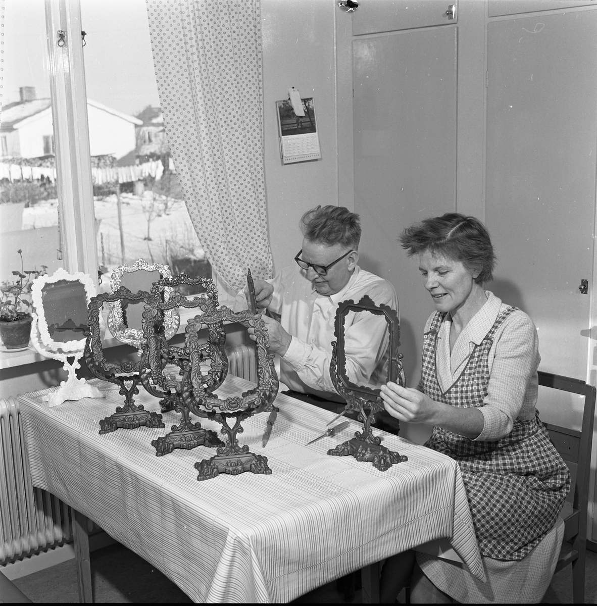 Ett par sitter vid köksbordet, i villakvarteret, med en uppsättning lika dana spegelramar uppställda. Kvinnan har förkläde på sig. På väggen hänger en almanacka.
