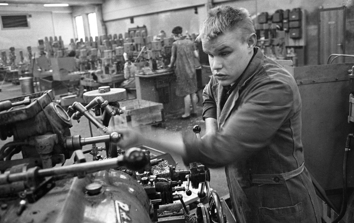 Arne Engström, iklädd skyddsrock, vid en maskin. Industrimiljö.