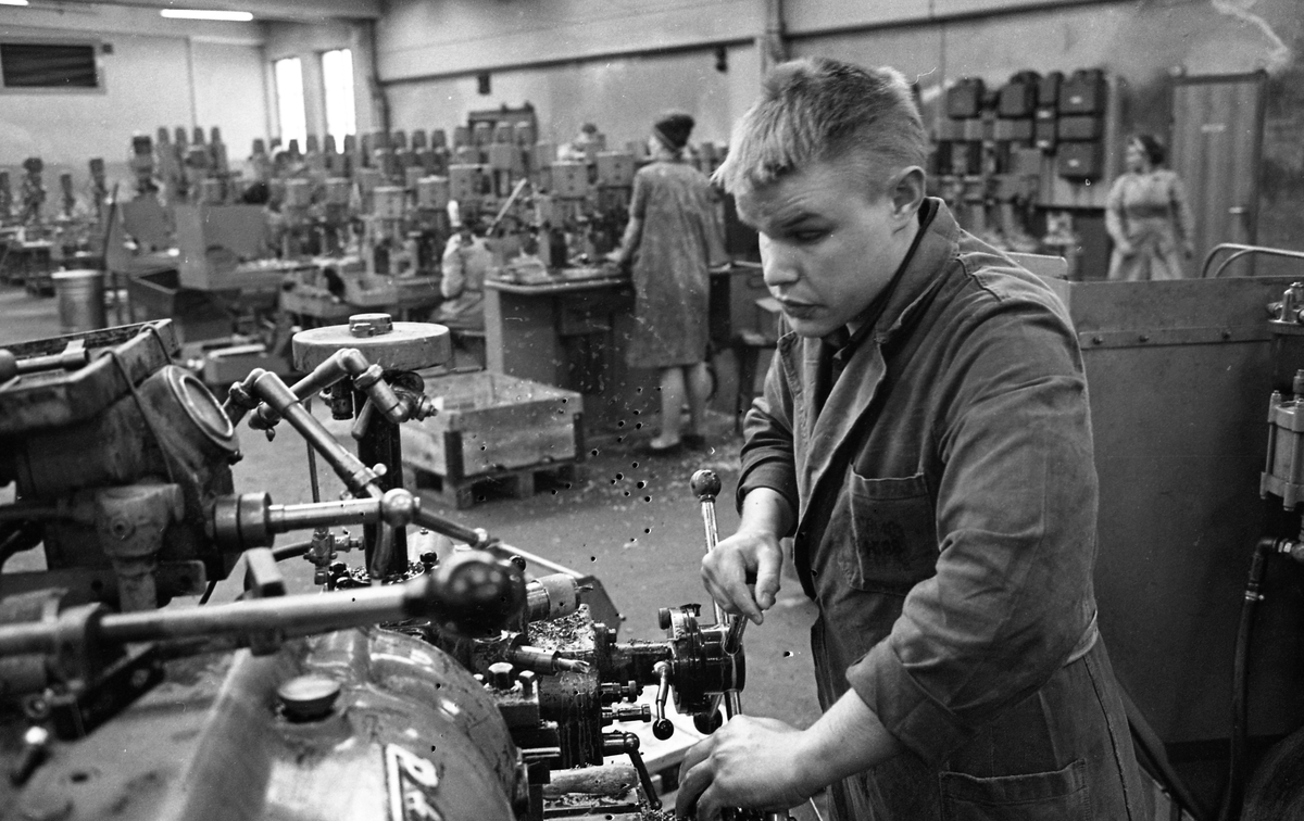 Arne Engström,iklädd skyddsrock, vid en maskin. Miljön är fabriksinteriör. I bakgrunden ses två kvinnor.