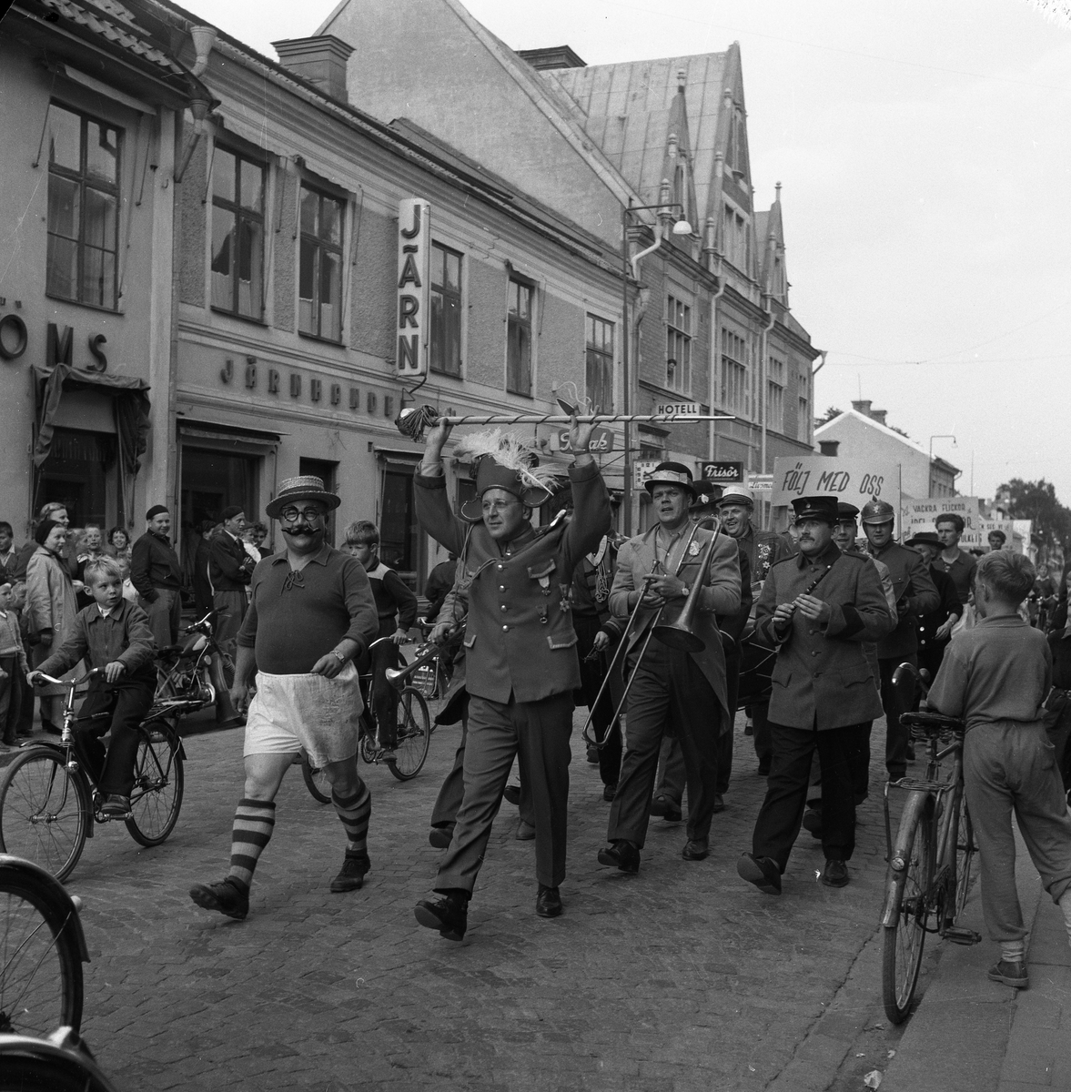 I halmhatt och kortbyxor går Rune "Sotarn" Andersson från Arbogas egen revyscen. Tamburmajor är kändisen Tore "Knatten" Andersson från "Vårat Gäng". Kapellmästare i dixielandorkestern är Gösta Hemming (trombon) och John Harrysson (flöjt) i främsta ledet. Bakom Harrysson ses Gunnar Ahl, som också medverkat i "Vårat Gäng".Långt bak, till höger, skymtar Larz-Thure Ljungdahl.