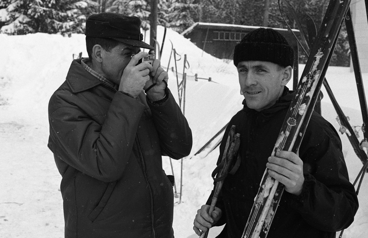 Mannen med kameran är Lennart Pettersson (Svarten). Han fotograferar Torsten Eriksson och hans skidor. Båda männen bor i Medåker.