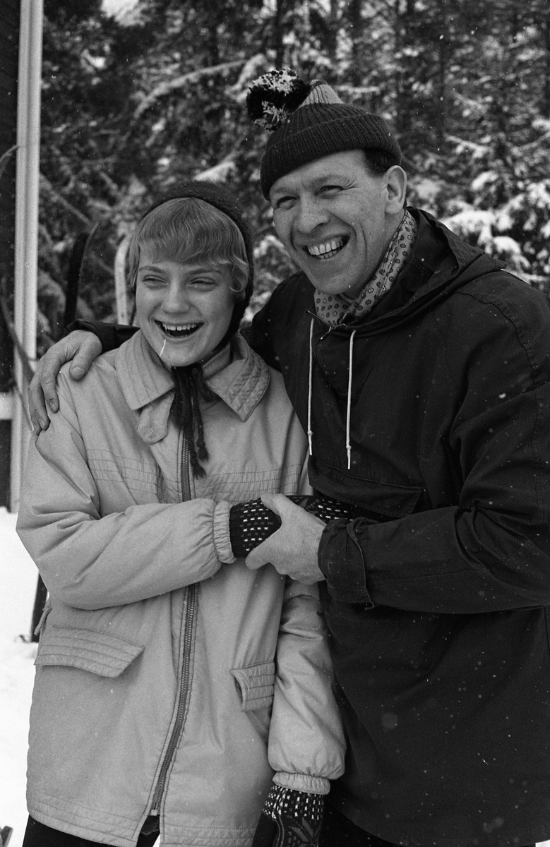 Skidtävlingen AT-loppet. Flickan heter Kristina Eriksson. Mannen i mössa och anorack är Anders Hill.