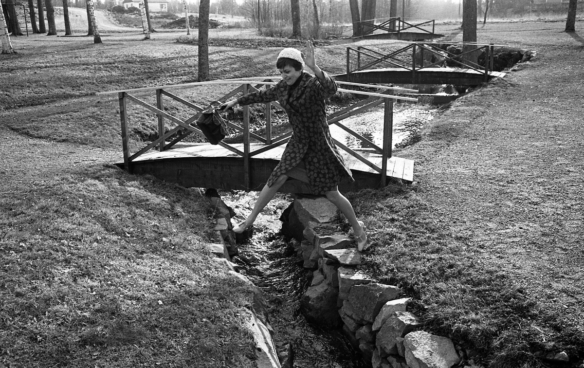 Kvinna som hoppar över bäck. Flera broar syns i bakgrunden.
