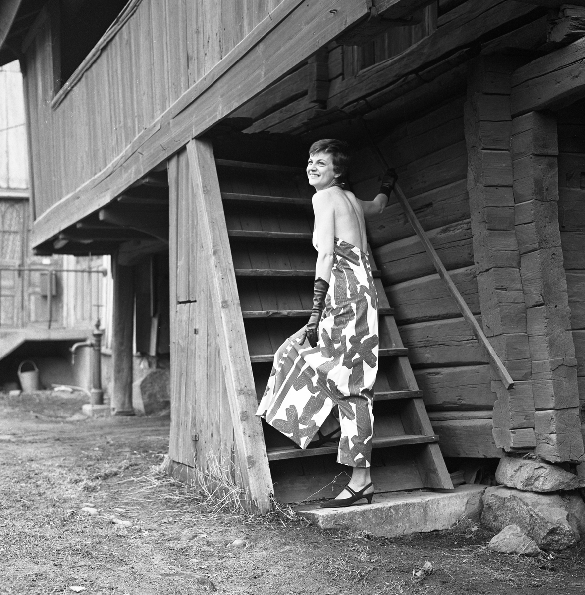Ateljé Touche. Marianne Rosenqvist visar mode; hellång klänning med bar rygg och långa handskar.