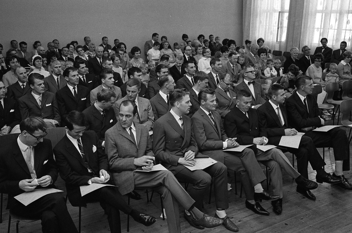 De färdiga ingenjörerna sitter på stolar. På de bakre raderna sitter kvinnor, barn och kanske föräldrar.
