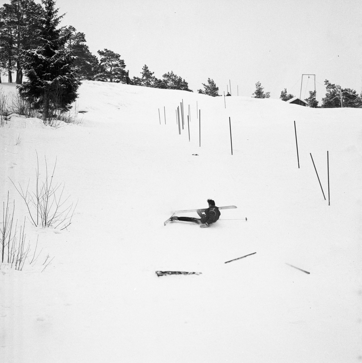 Arboga Tekniska Skola har idrottsdag. En person har åkt omkull i slalombacken.