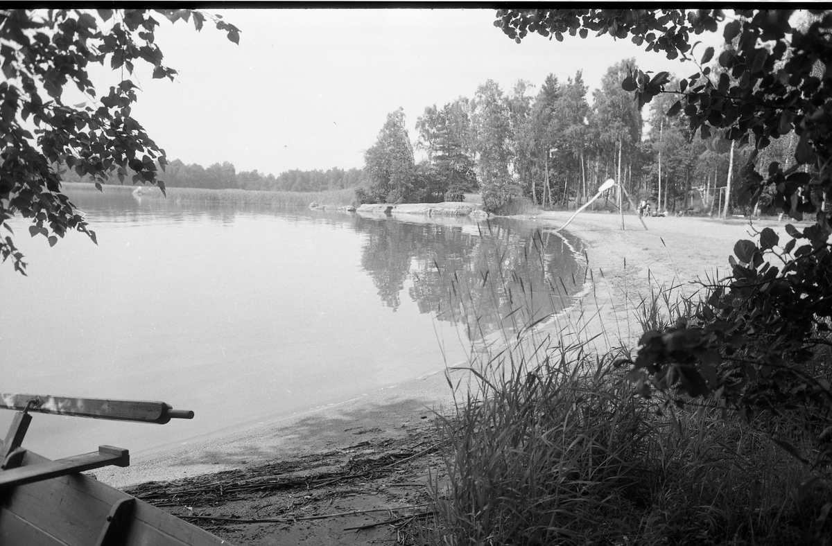 Hällarnas badplats på Ålhammars udde i Hjälmaren. En roddbåt anas i förgrunden och en rutschkana i bakgrunden.