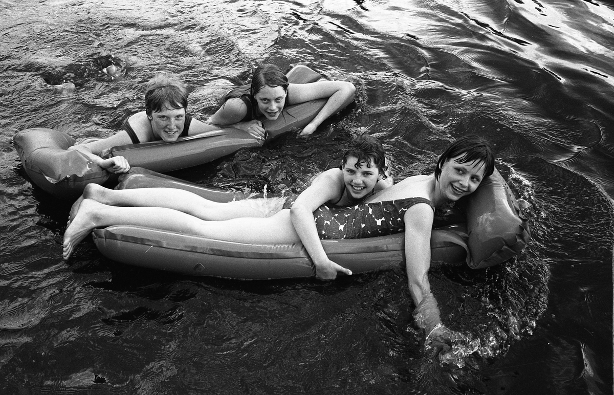 Fyra flickor, med uppblåsbara gummimadrasser, på Villagatsbadet. Bakre madrassen: Gerd Kjellberg (vänster) och Kristina Bohlin (höger). Främre madrassen: Eva Andersson (vänster) och Marie Åkerblom (höger)