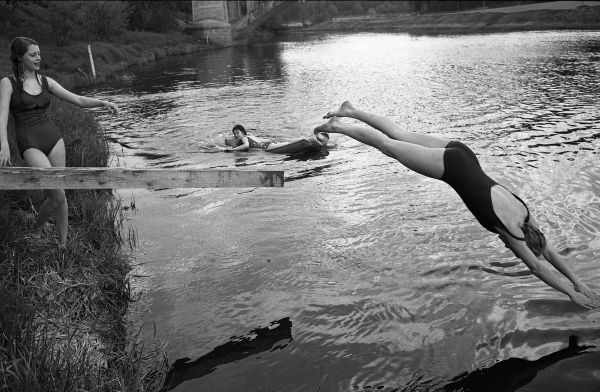 Flickor som badar vid Villagatsbadet. En av dem dyker i Arbogaån.
