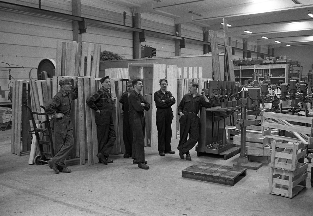 Personal vid Arboga Maskiner. De står och lyssnar på några medlemmar från Frälsningsarmén som sjunger för dem på arbetsplatsen. Interiör. Maskiner och trälådor.