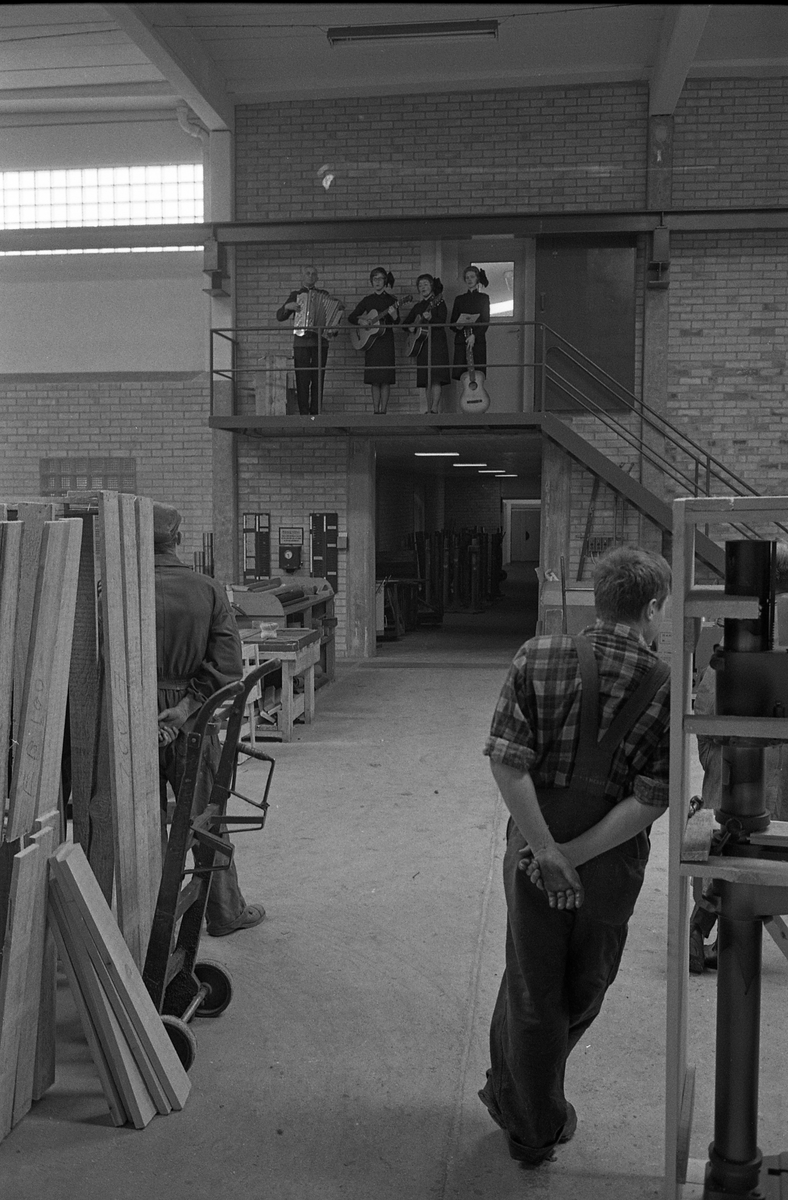 Frälsningsarmén sjunger på Arboga Maskiner. En man med dragspel och tre kvinnor med gitarrer uppträder från en hög trappa. Arbetarna står nedanför och lyssnar. Interiör.