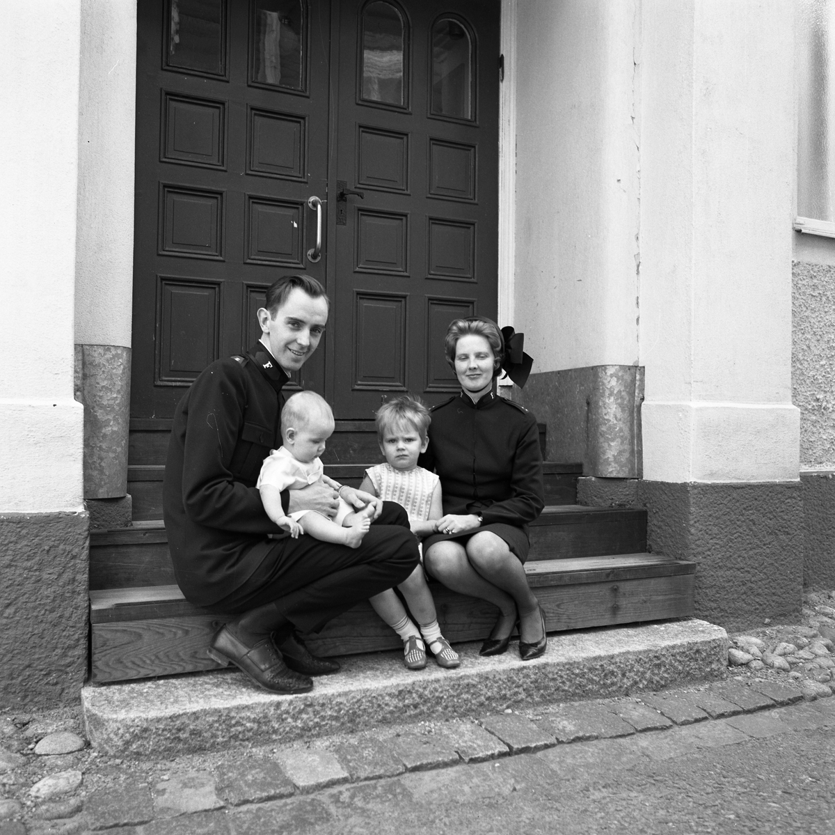 Man och hustru med två små barn, sitter på trappan till Frälsningsarméns kyrka