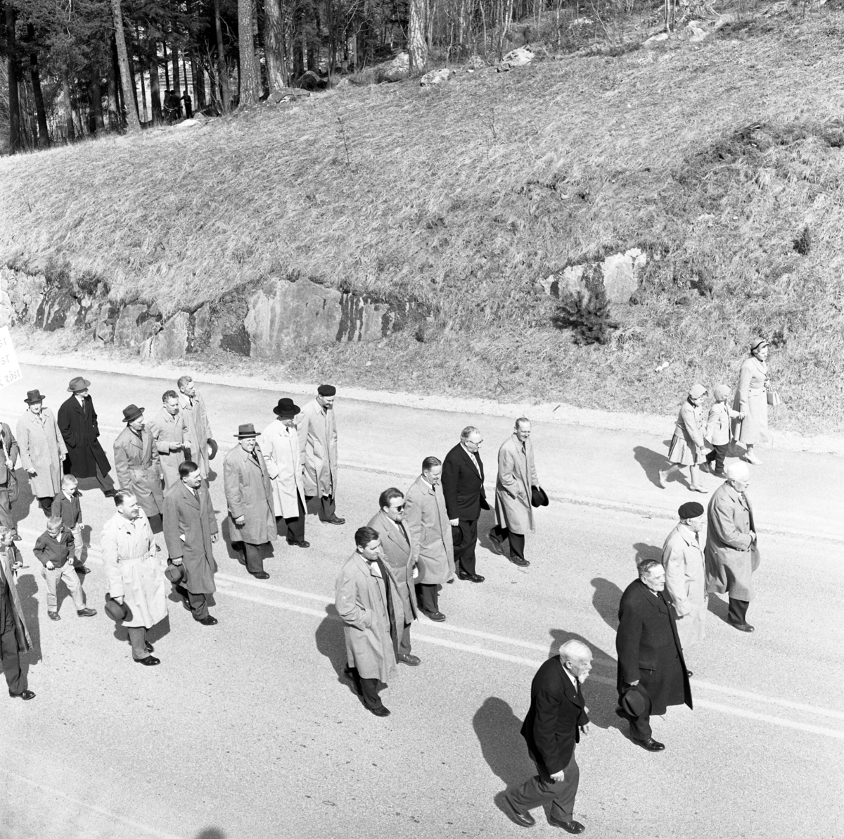 Första maj. Demonstrationståg. Herrar i hatt och överrock går i prydliga rader.