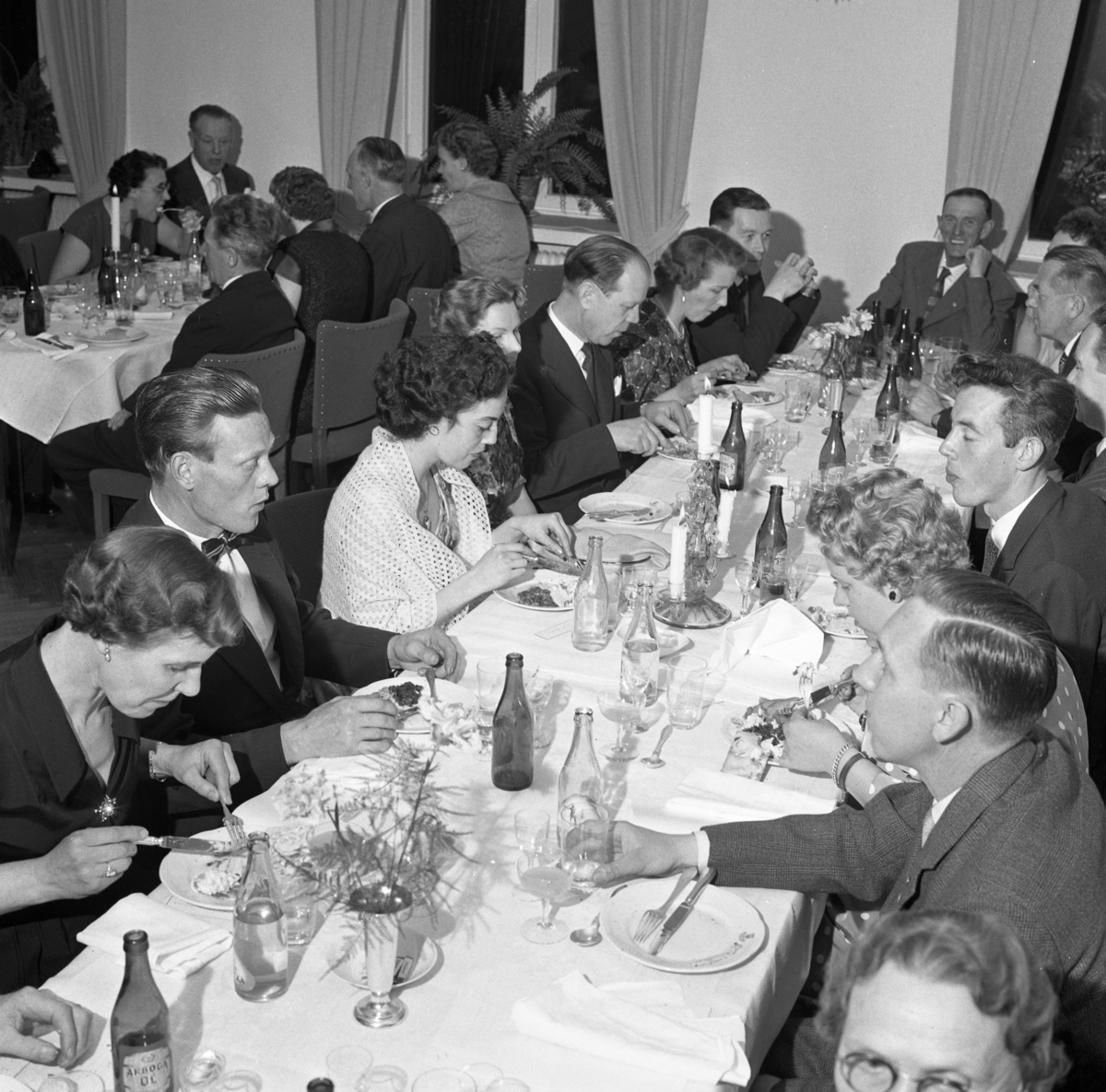 Elektrikerförbundets Arbogaavdelning har jubileumsfest. Män och kvinnor sitter till bords och äter. Borden är dukade med blommor i vas och ljusstakar. Herman Skoglund (nästan mitt i bild) med näsduk i fickan. Snett mitt emot honom, ses profilen på Gustav Danielsson.