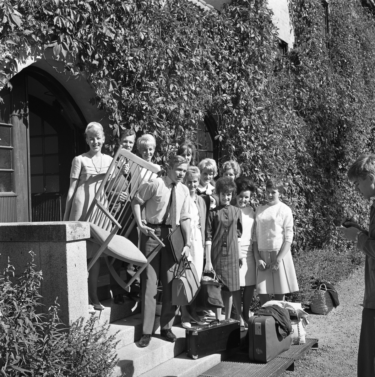 Nio unga kvinnor och två män står på en trappa utanför en port. Väggen är täckt av vildvin. De bär på en karmstol. Två resväskor och annat bagage står på grusgången. En man tittar i en anteckningsbok.