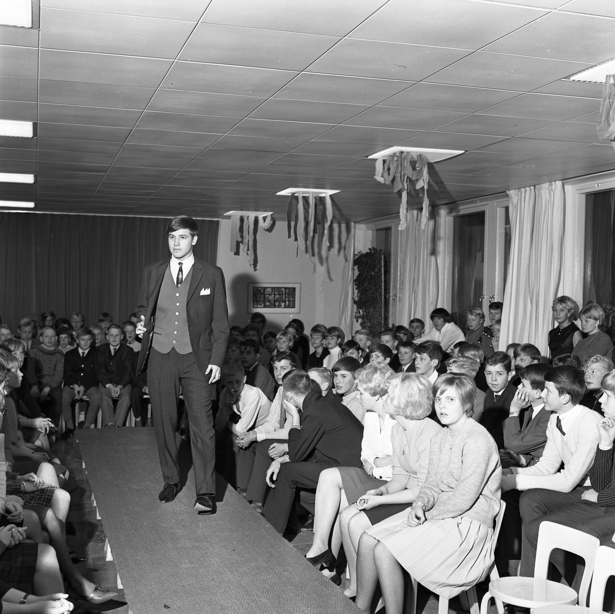 Elevernas modevisning på Stureskolan. Jan Pettersson visar kostym och väst.