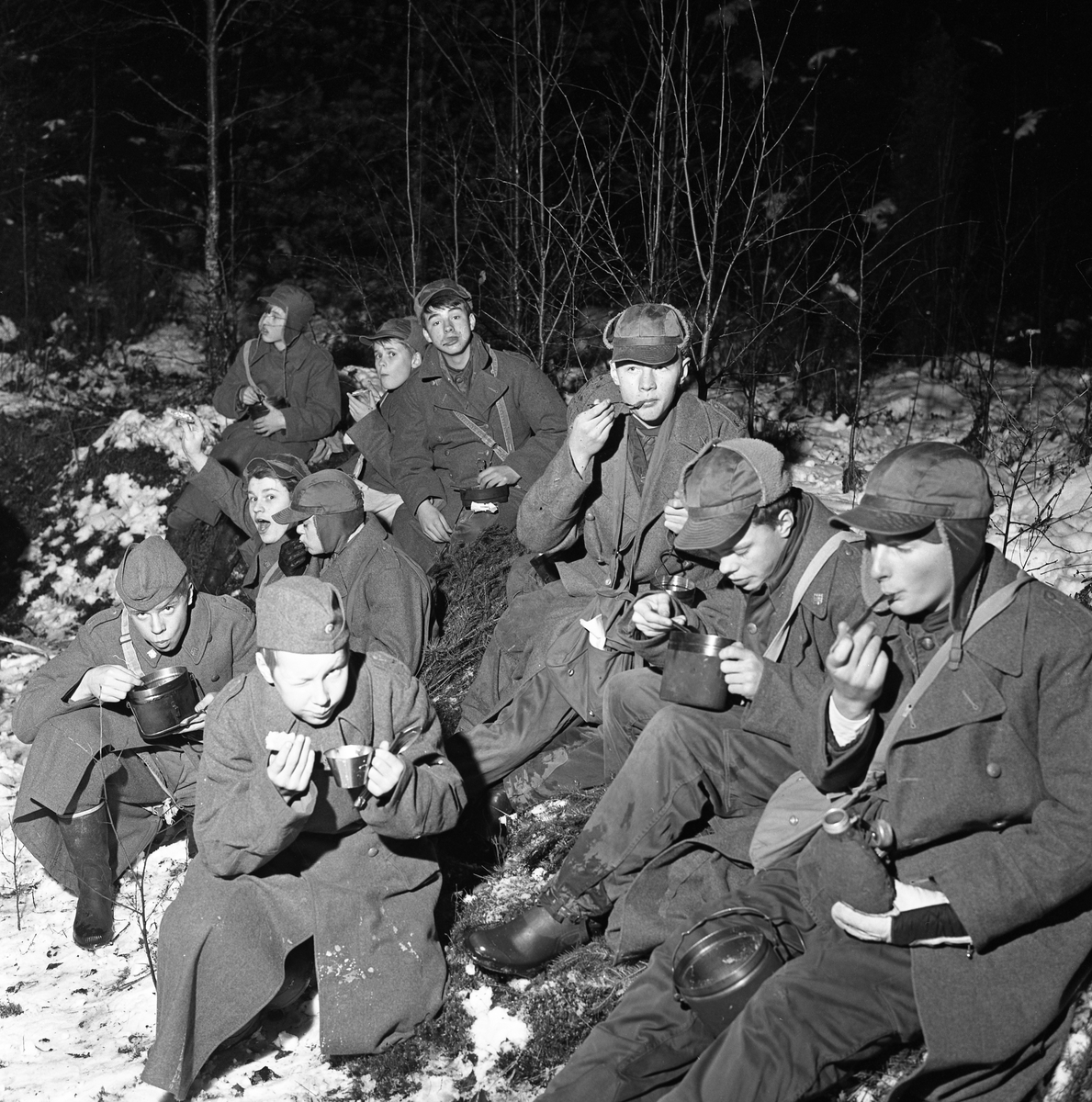FBU-ungdomar övar i skogen. Det är vinter och snö. Grabbarna sitter på granris och äter ur sina plåtburkar. De är iklädda yllerockar och mössor med öronlappar. Några har båtmössor.