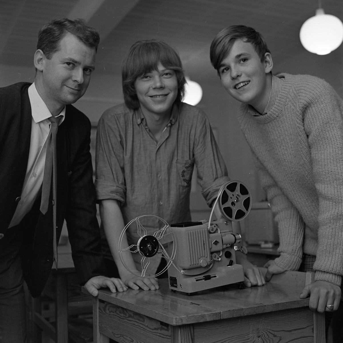 Filmgrupp på Stureskolan. Läraren heter Leif Ullström och eleverna är Kenneth Jansson och Claes Wadsten.