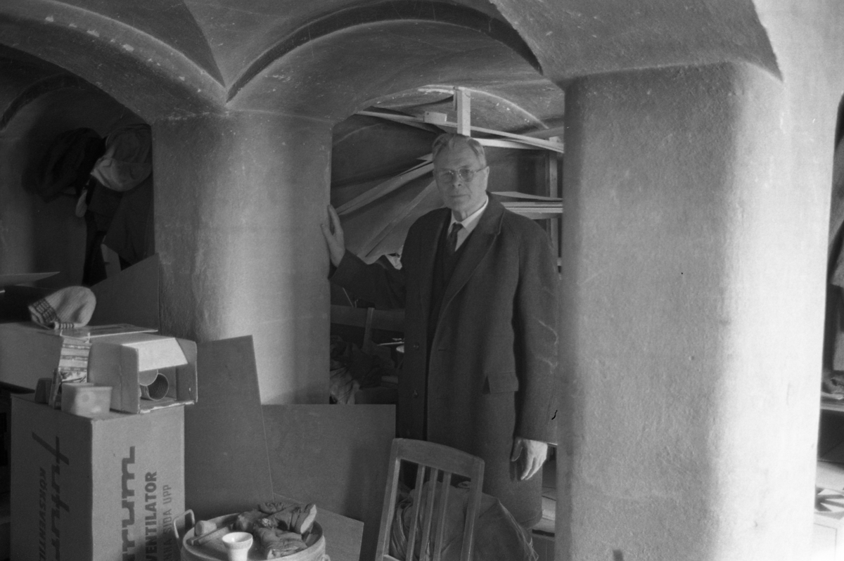 Gillis Lund ser på valven i Söderlunds snickeri på Västerlånggatan