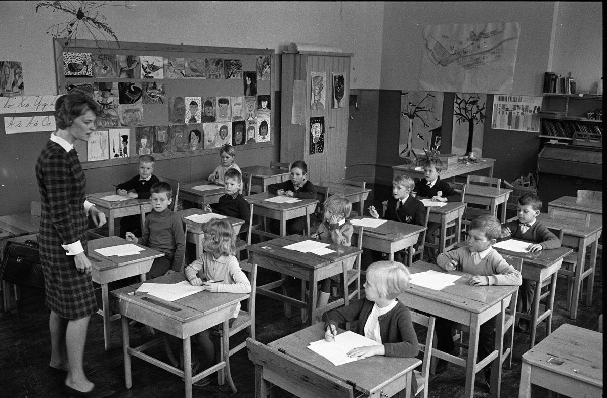 Det är skolmognadsprov hos lärarinnan Eva Möller. Pojken som sitter rakt framför fröken, är Stefan Janse. Allra längst bak, i tredje raden från väggen räknat, sitter Stefan Frennemo. Flickan närmast fotografen är Ann Almqvist. Barnen sitter vid var sin skolbänk. De har pennor och papper att arbeta med.
