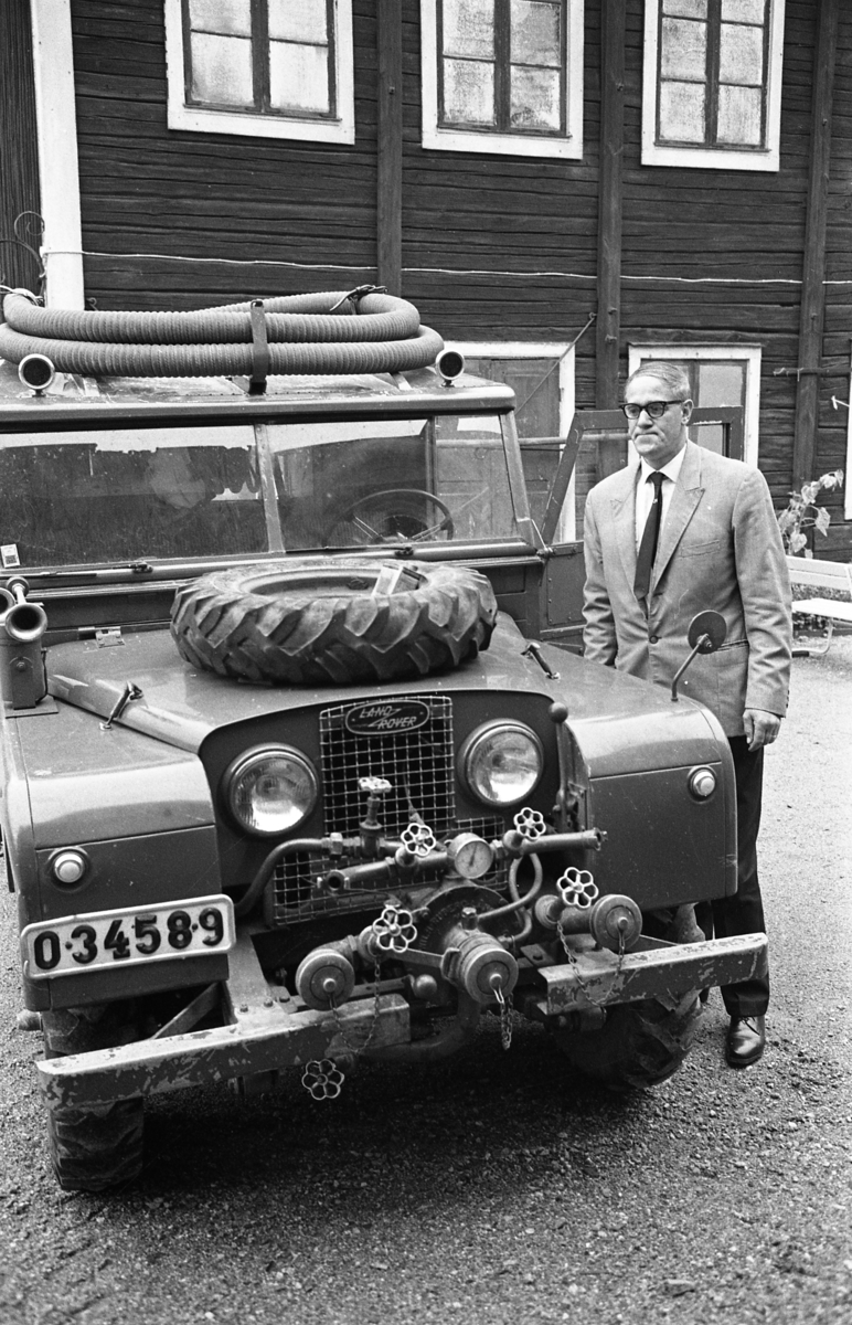 Polisman Sigurd Granberg inspekterar en stulen brandbil. I bakgrunden ses ett flervånings trähus.