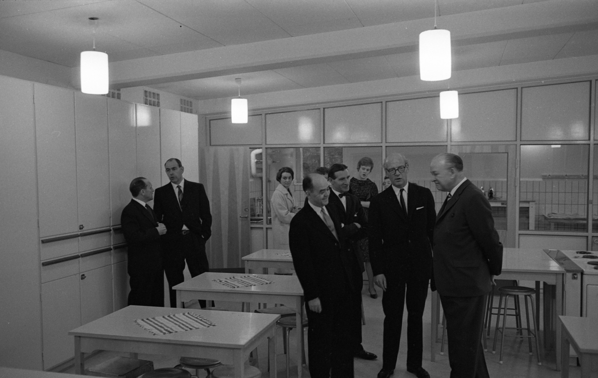 Stureskolan invigs. Kvinnor och kostymklädda herrar i köksmiljö. Kanske lektionssalen för hemkunskap. Här finns små bord med dukar på och en spis skymtar.