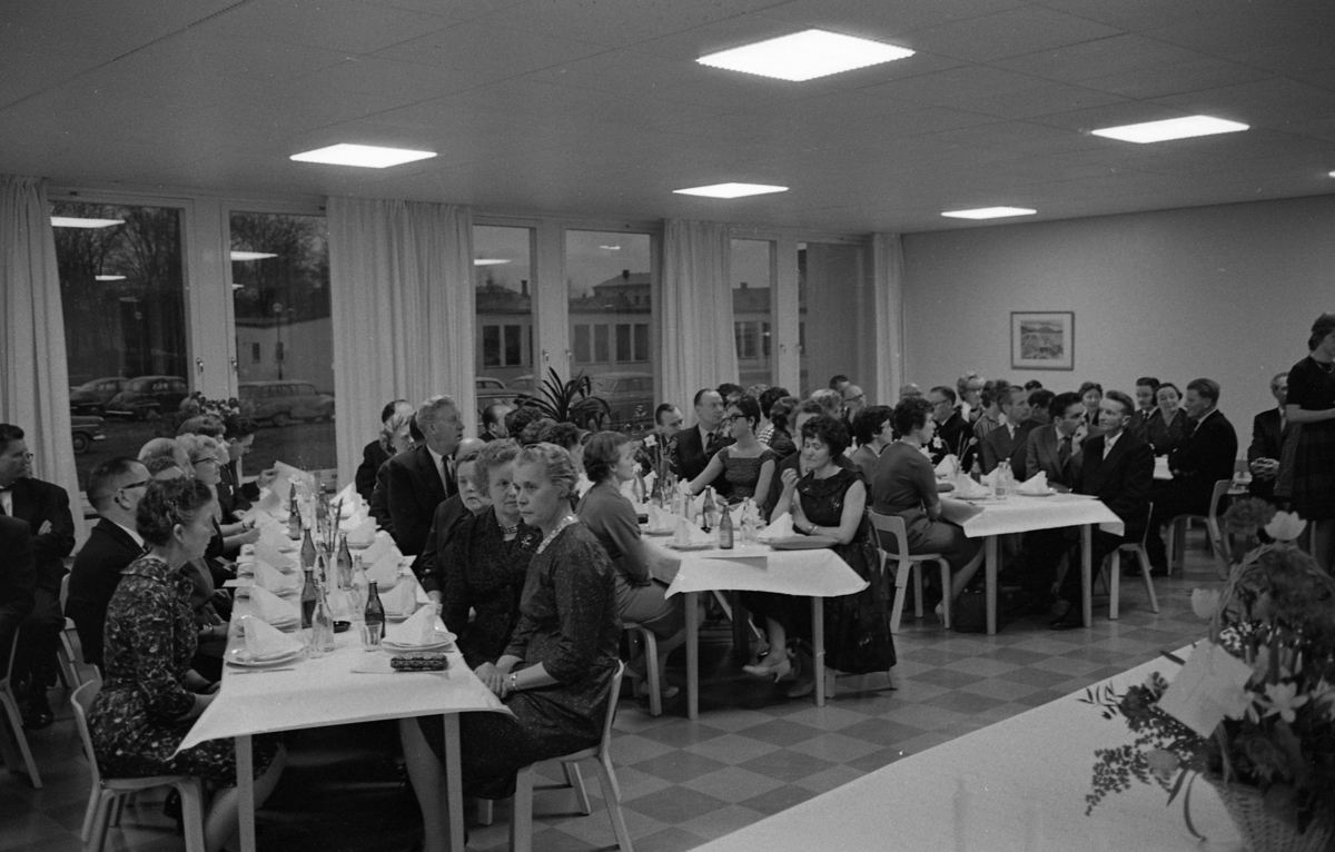 Invigningsfest på Stureskolan. Vid dukade bord sitter festklädda damer och kostymklädda herrar.