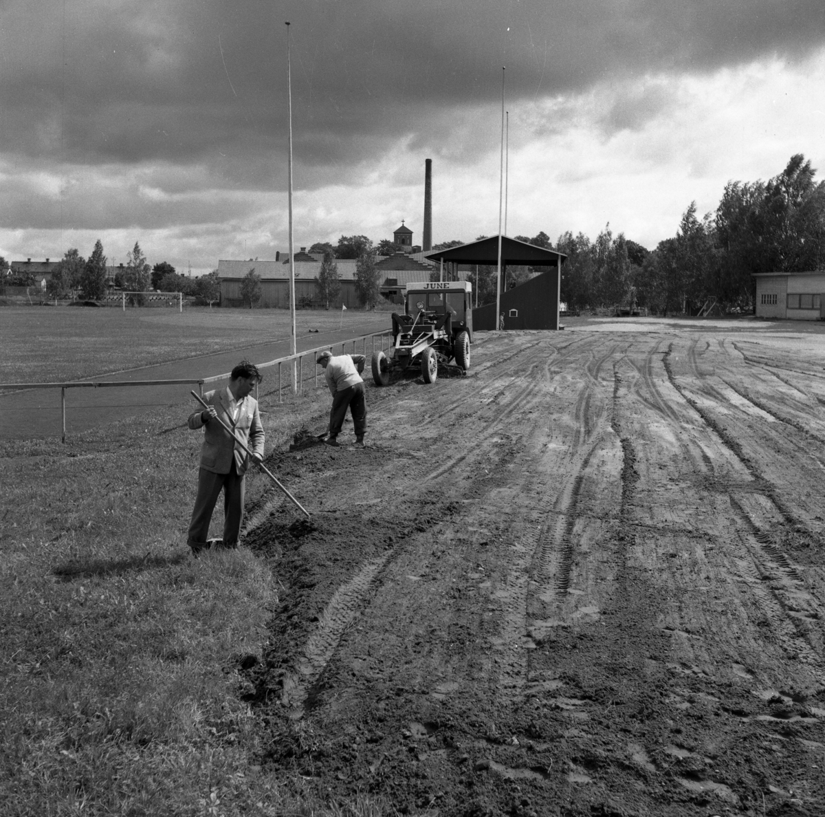 Sturevallen. Här förbereds för en ny ishockeybana. Två män och en traktor i arbete. Mannen i förgrunden är Olle Kropp.