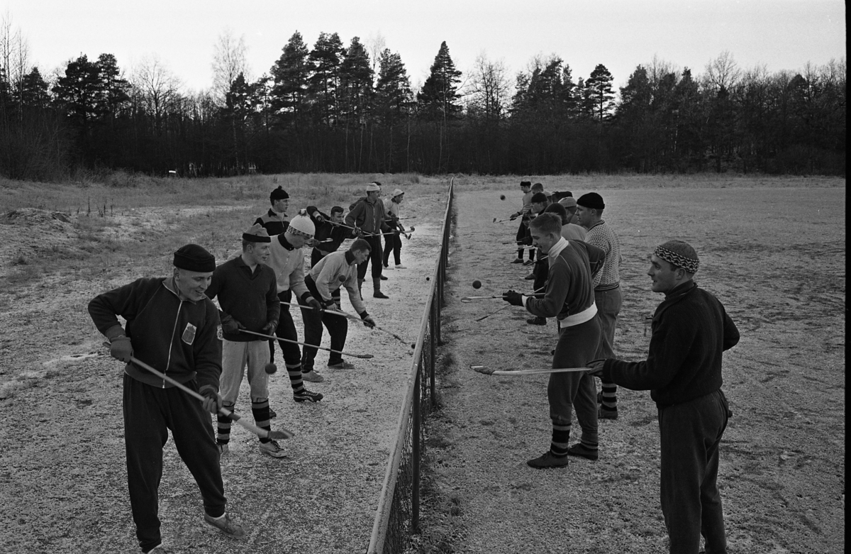 Södra IF har bandyträning. Nitton spelare står i två rader med ett nät mellan sig. De är utomhus.