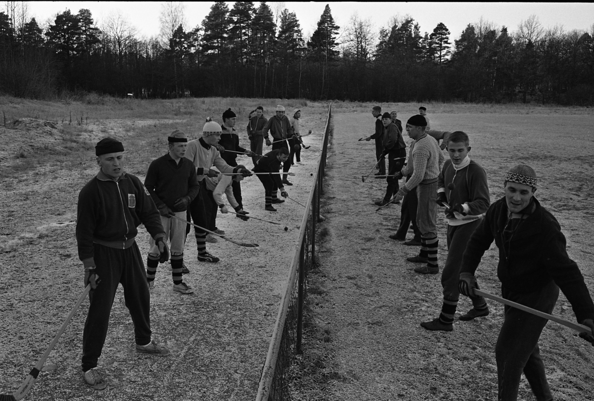 Arboga Södra IF har bandyträning. Spelarna har övningar utomhus, på ett fält. Alla har klubbor i händerna.