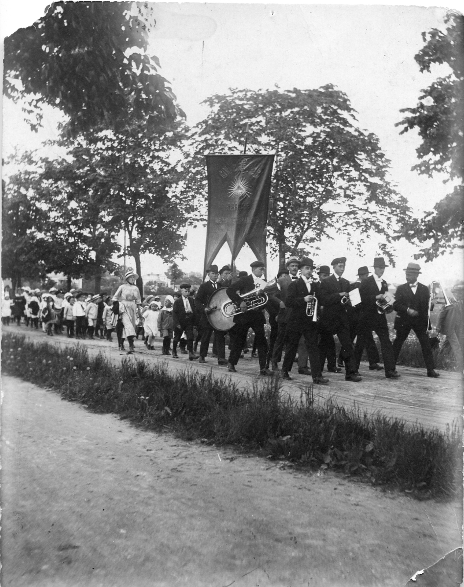 Söndagsskolan har fest. Barn och vuxna tågar på en grusväg nära vattnet. Främst går en blåsorkester. En man bär en fana.