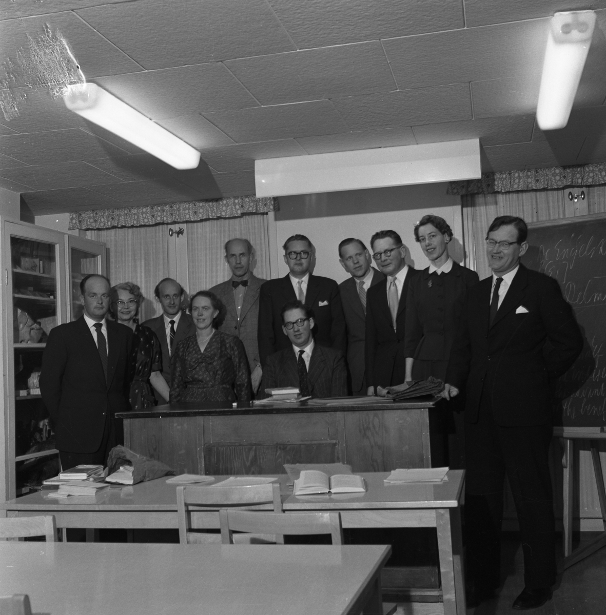 Män och kvinnor är samlade runt katedern i ett klassrum. På bänkarna ligger uppslagna böcker. En svart tavla syns bakom gruppen.