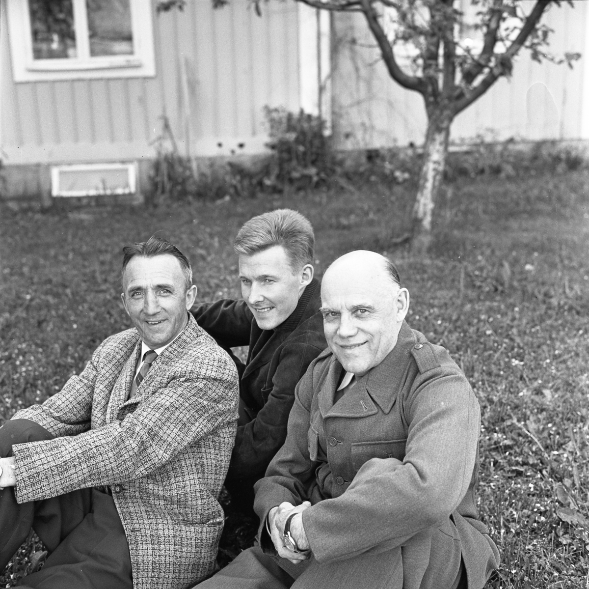Tre män sitter på gräsmattan i trädgården. Mannen längst till höger är Gunnar Tallqvist/Gunnar Tallkvist