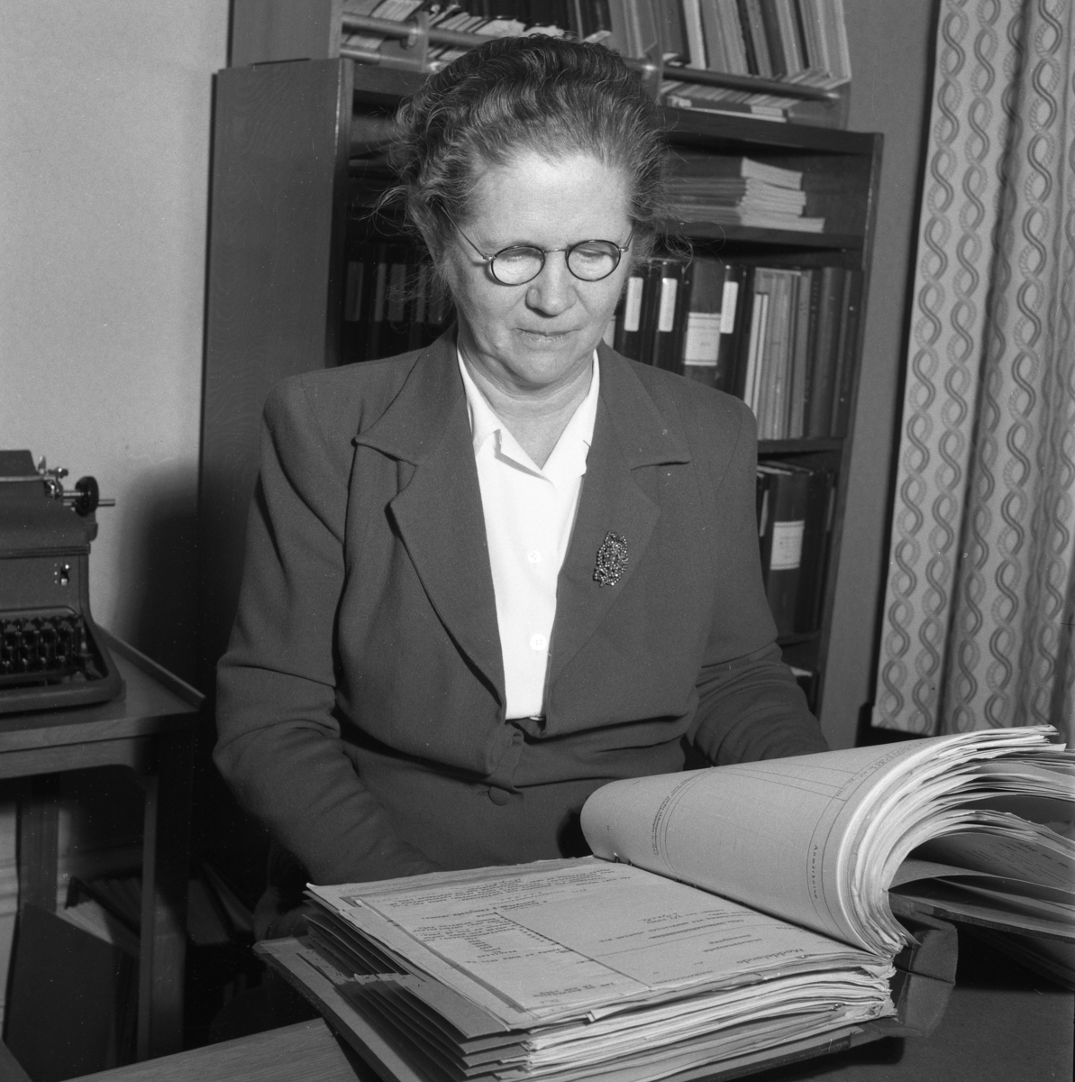 Kvinna som sitter vid skrivbordet och bläddrar i en pärm. Bakom henne ses en skrivmaskin på ett lågt bord, en bokhylla med pärmar samt en gardin.