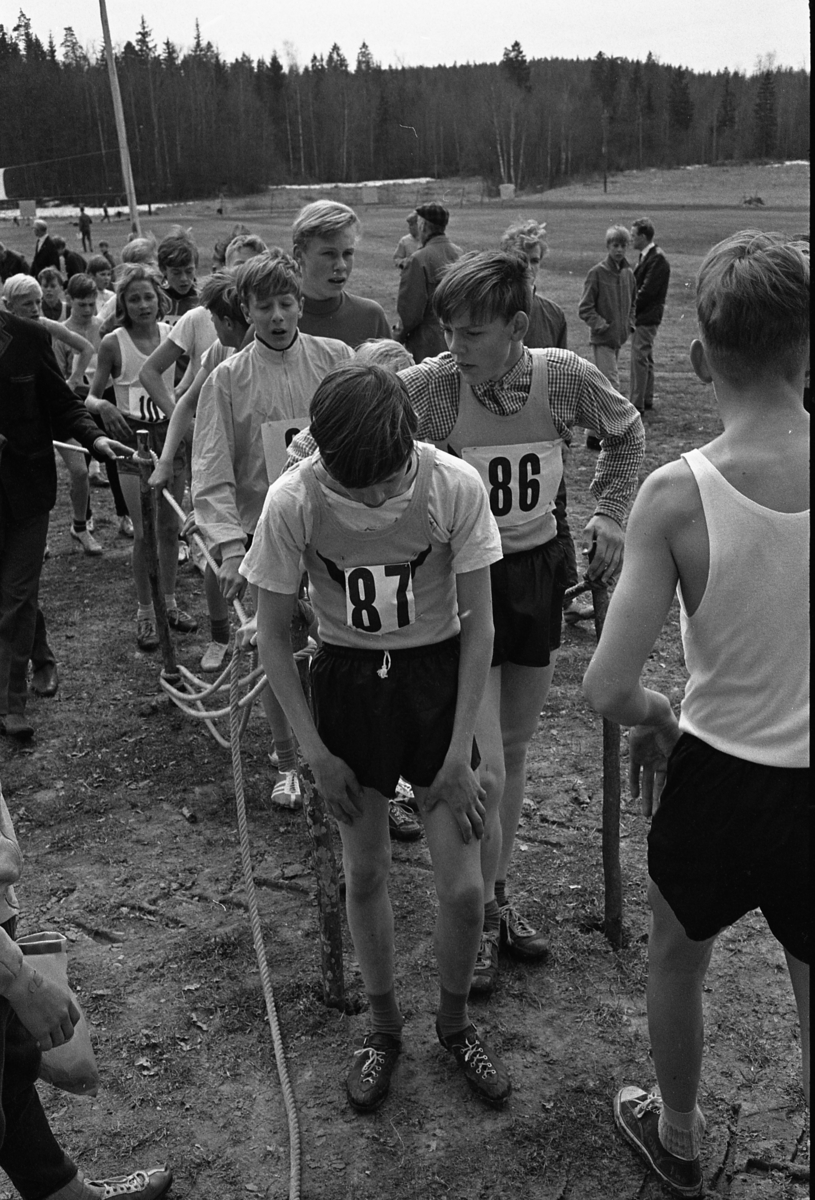Målfållan är full av trötta ungdomar med nummerlappar på bröstet. Skogen ses i bakgrunden.