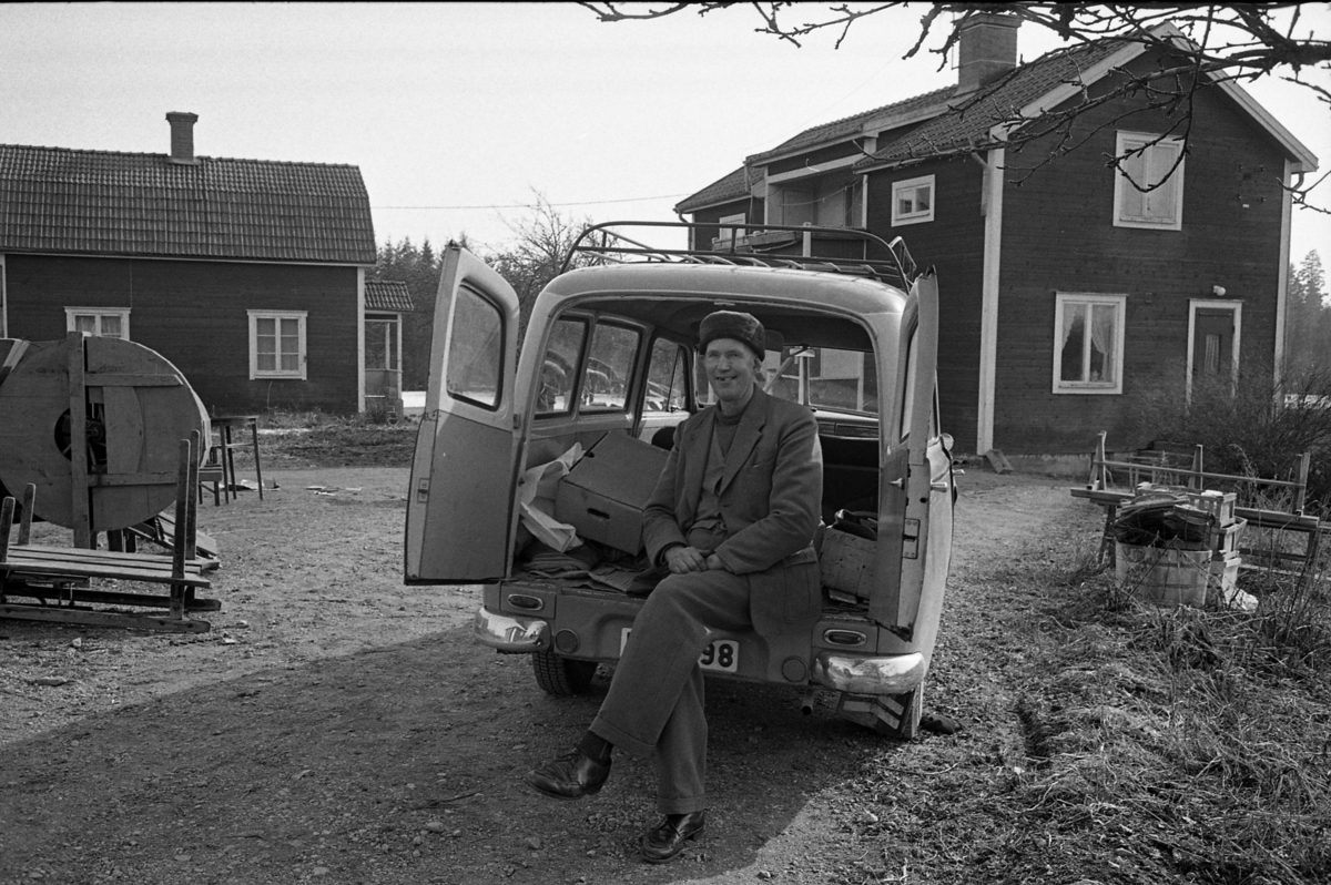 Tore Andersson, Mossen. Han har öppnat bakdörrarna på sin bil och sitter där. Diverse föremål finns på gårdsplanen. Bakom bilen ses två bostadshus.