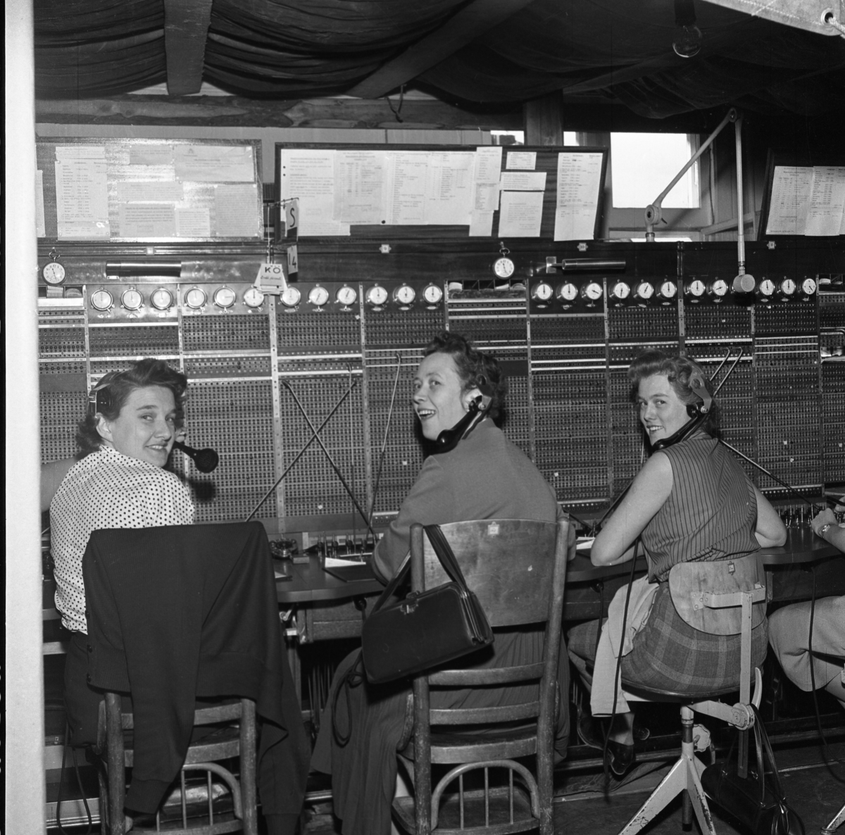 Klockorna, som hänger på rad, visar hur många perioder samtalen varat. Kvinnorna har en telefonlur hängande intill örat.