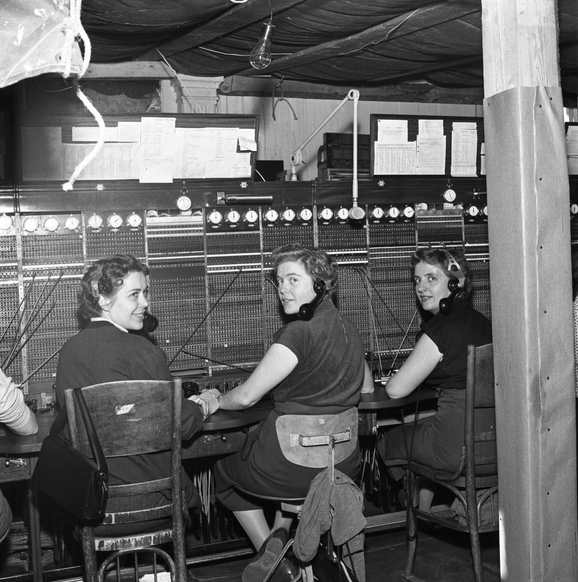 Trots brandskadorna i Televerket på Nygatan, så fortsätter telefonisterna arbetet vid växelborden. I mitten sitter Mary Pettersson. Kvinnorna har en telefonlur fastsatt vid vänster öra. En presenning är spänd över arbetsplatsen för att inte vattnet, från släckningsarbetet, ska skada växeln. En ensam glödlampa hänger i taket.