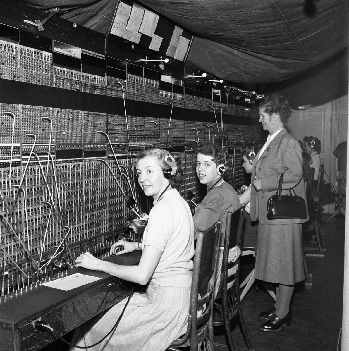 Växeltelefonisterna sitter på rad. Var och en har en telefonlur vid sitt vänstra öra. Bakom kvinnorna står telekommissarie Eva Geete/Gethe.